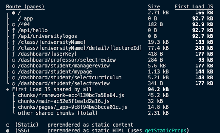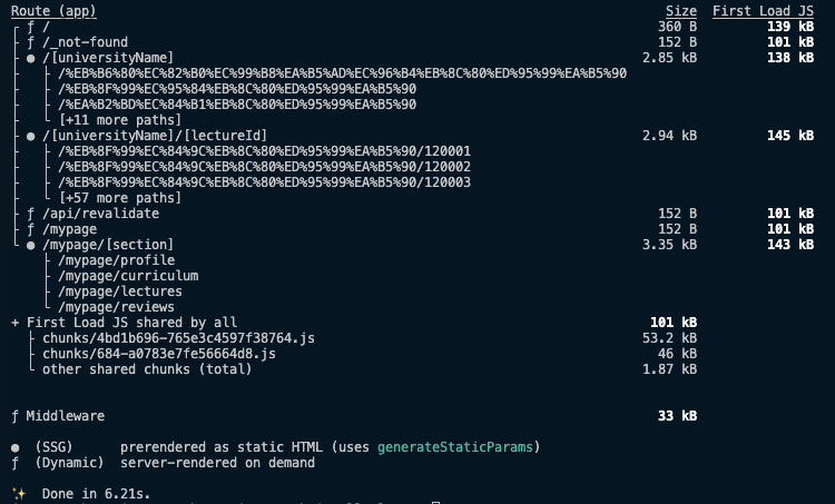 /[universityName]/[lectureId]): 하이브리드 렌더링으로 강의 정보는 정적 생성, 리뷰는 클라이언트 페칭